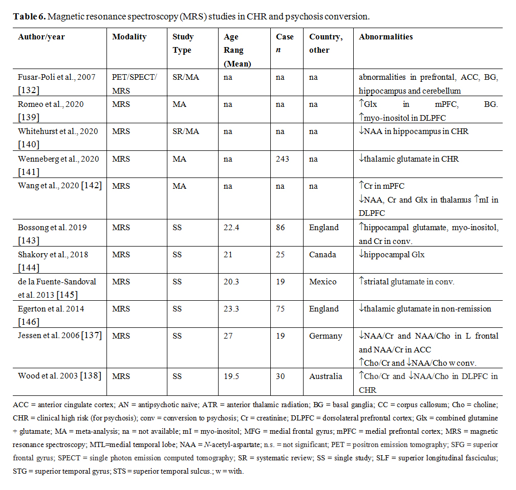 Table 6. Magnetic resonance spectroscopy (MRS) studies in CHR and psychosis conversion.