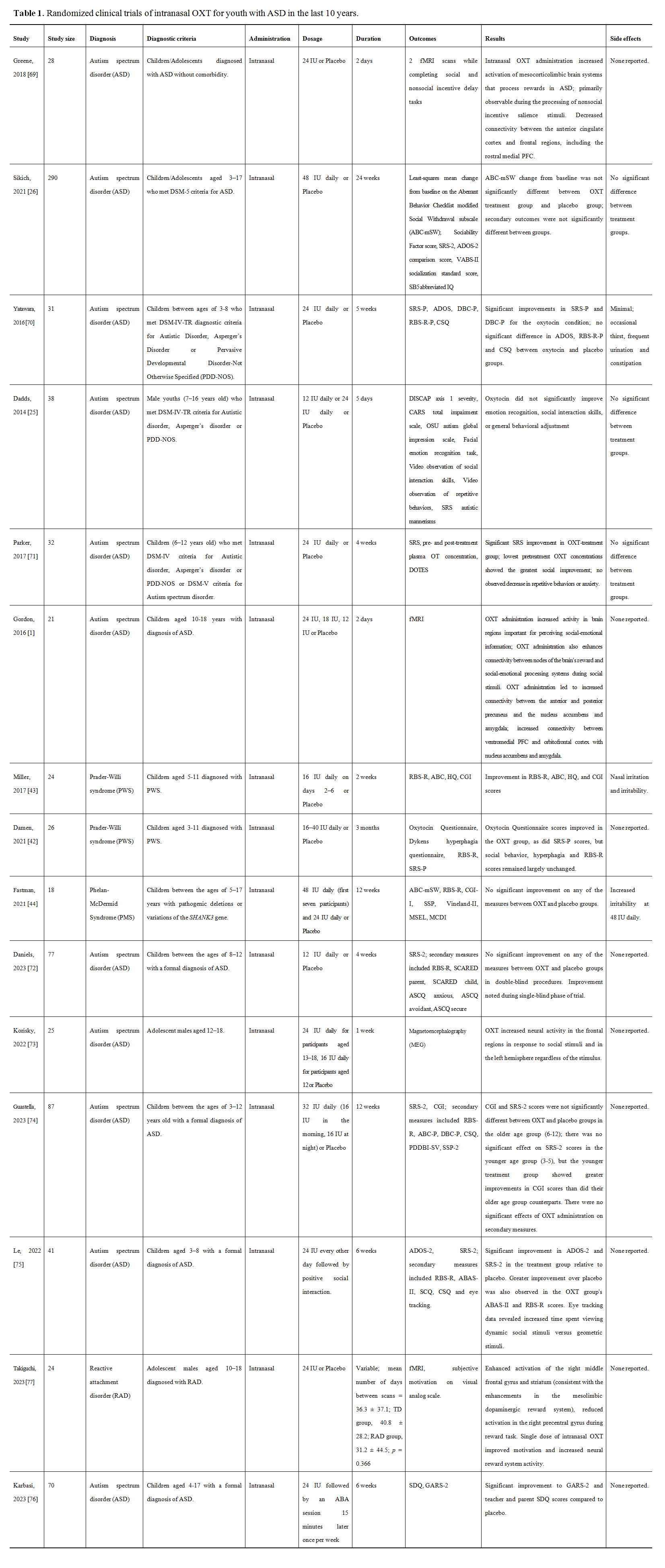 Because of OXT’s connection to social functioning [48], ASD, PWS and PMS have been the foci of most intranasal OXT research to this point. While social functioning is not the focus of this review, all three of these disorders can manifest clinically with irritability [53,54,57]. In this mini review, we present the summary of results from 15 clinical trials published between 2014 and 2023 that explore the effects of intranasal OXT on pediatric patients with ASD, PWS, PMS or RAD.