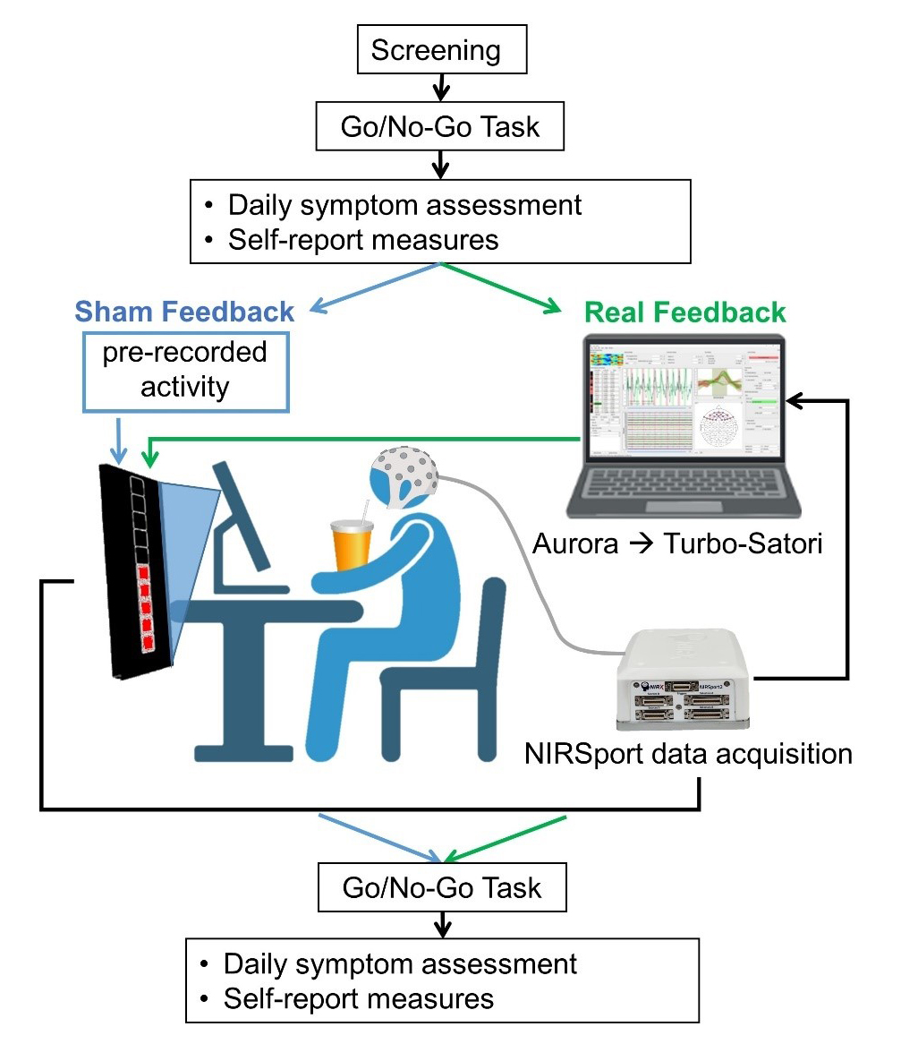 Functional near-infrared spectroscopy (fNIRS)-based neurofeedback may be ideal for the treatment and study of BN. FNIRS is an optical brain imaging technique that measures changes in cortical blood oxygenation, a signal very similar to the blood-oxygen-level dependent signal that is measured in fMRI. Although its spatial resolution is inferior to fMRI, it has higher temporal resolution, and it can reliably assess hemodynamics in cortical areas integral for inhibitory control [11]. In addition, because fNIRS has near-zero run-time costs, it is portable, and recent technical and software advancements have helped automate much of the fNIRS neurofeedback process, it is more clinically deployable than fMRI. Relative to electroencephalography (EEG), fNIRS has better spatial resolution and requires less set-up (e.g., time-consuming gel/water application is not needed for sensors over the scalp) [12]. Critically, since fNIRS sensors are wearable and less sensitive to motion than fMRI or EEG, the wearer can learn to self-regulate activation in real time during clinically relevant behaviors, like eating. FNIRS neurofeedback studies report successful PFC modulation and behavioral changes in other impulsive populations after a single session [13], supporting the method’s potential utility for BN.