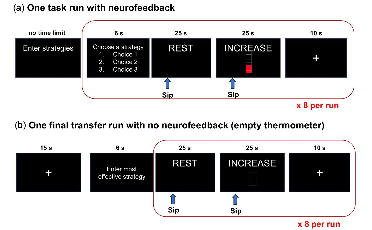 Figure 3. Neurofeedback trial design. (a) One example task run with neurofeedback. Participants complete four runs while receiving neurofeedback based on their right lPFC activation. (b) One final transfer run with no neurofeedback. Participants choose the strategy they found to be most effective to use throughout the entire run.
