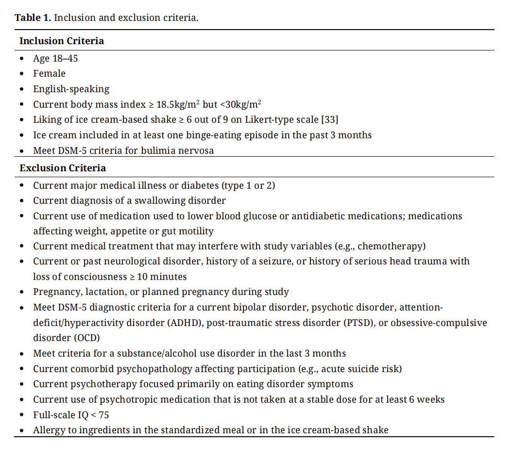 Adult females with current DSM-5 (Diagnostic and Statistical Manual of Mental Disorders, 5th Edition) BN (N = 30) will be recruited from ongoing observational studies of BN at Mount Sinai as well as through online, listserv, and flyer advertising. After prospective participants indicate study interest, they will complete brief phone screening procedures to ensure that they meet our inclusion and exclusion criteria (Table 1).