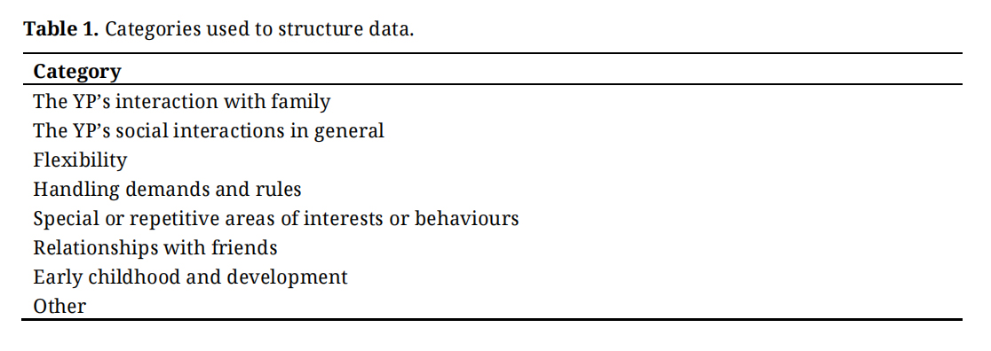 Authors MJ, TL, and MB all took part in phase 1 (familiarization with data), where data was read and re-read to ensure familiarity with the data and to generate initial thoughts about the data together. After the initial familiarization, MJ, TL, and MB agreed that the nature of the dataset meant that some data was not related to the research aim and therefore agreed on eight categories to identify and organize data relevant for the research aim (Table 1). The categories were based on diagnostic and theoretical knowledge regarding autism and potential arenas for compensatory behaviours. This initial predetermined categorization can be described as a deductive approach to the data and may be necessary when using documents, e.g., patient records, where not all content is directly related to or relevant to the analysis [44].