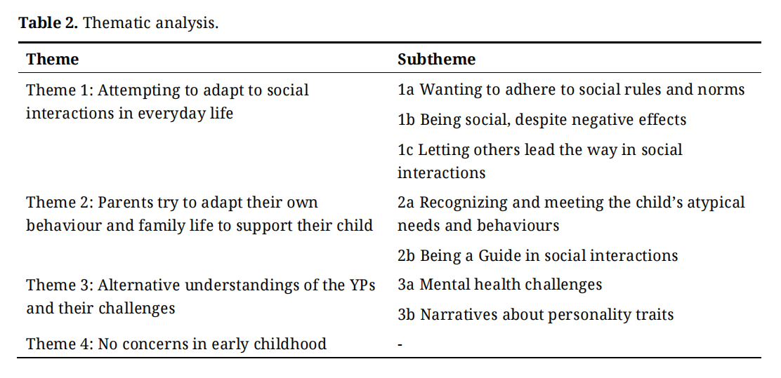 The analysis revealed four themes summarizing common patterns in the material. The first theme described how the YPs tended to have engaged in social communication similar to their peers albeit often at a cost. The second theme unfolded a range of ways that the parents had recognized the child’s atypical needs, supported the YP’s daily life, minimized stressors and guided the YP’s social life. The third theme illustrated how families made sense of the YP’s atypical needs and behaviours as either mental health challenges or personality traits, whereas the fourth theme summarized that these YPs mostly did not show signs of autism in the first three years of life, including no delayed language development or focused or repetitive areas of interests, which further adds to the understanding of why families looked for other explanations to make sense of the child’s atypical needs and behaviours.