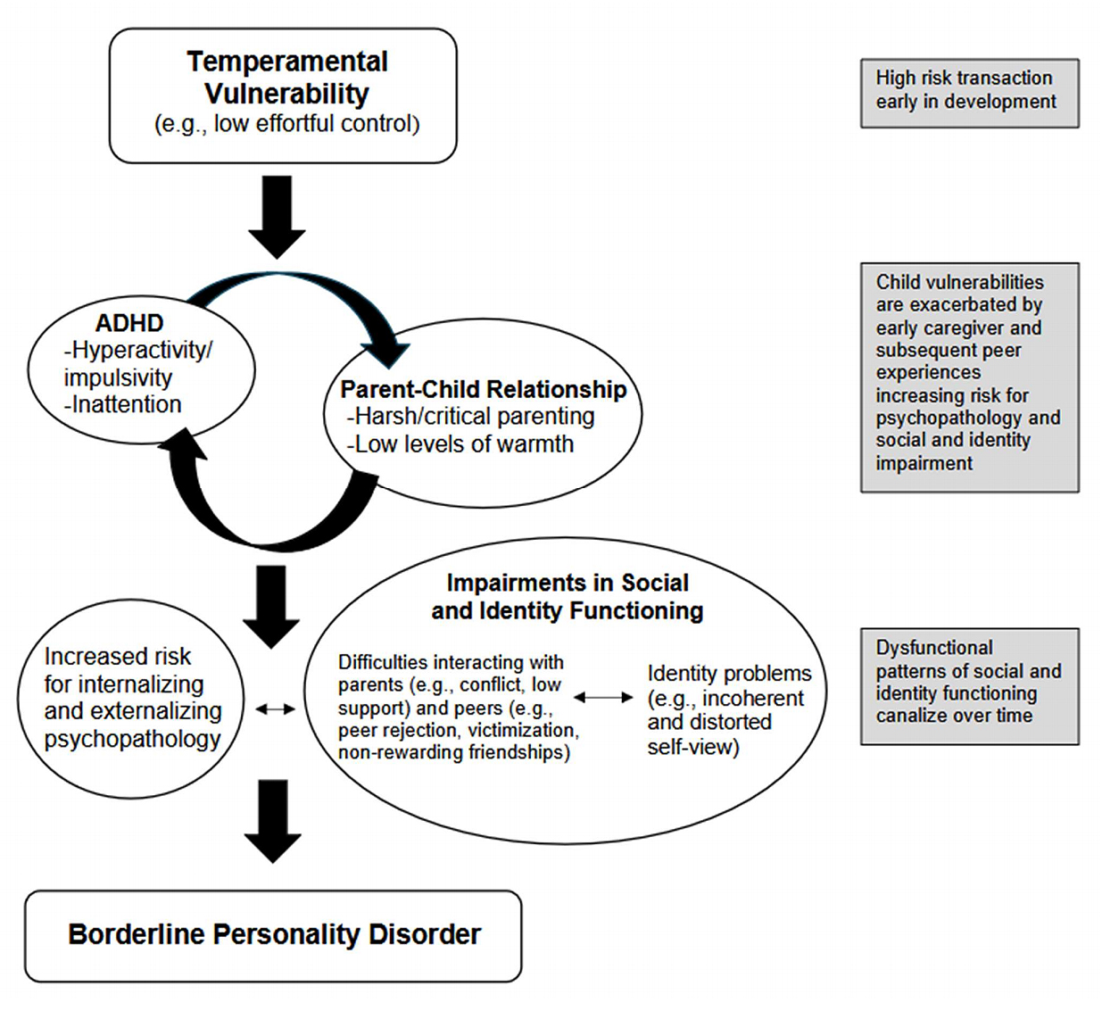 Borderline personality disorder (BPD) is one of the most stigmatized mental health disorders, characterized by profound social dysfunction, risk for suicide, and long-term and costly mental health care [1]. Although traditionally diagnosed among adults [2], disproportionately among women, there is accumulating evidence that the developmental origins of BPD can be traced back to childhood [1,3]. In particular, girls with ADHD are at elevated risk for the development of BPD [4–6]. As many as 60% of women with BPD retrospectively report a childhood diagnosis of ADHD, and prospective longitudinal studies show that as many as 20% of girls with ADHD develop BPD by adulthood [4]. Even in childhood and adolescence, girls with ADHD demonstrate elevated levels of BPD features that are uniquely associated with poor outcomes [4,7,8]. Yet very little empirical research has examined early mechanisms and developmental pathways to risk for BPD in girls with ADHD, missing opportunities to mitigate risk for BPD across the lifespan. In this Viewpoint, we review developmental psychopathology theory, describe recent empirical work, and outline steps for future work in order to promote continued research focused on reducing the risk for BPD among girls with ADHD.