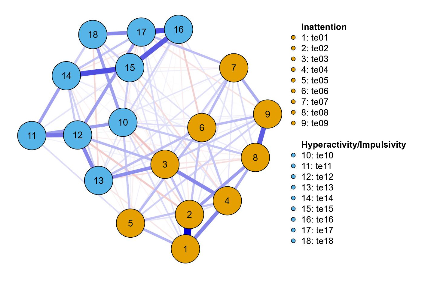 Figure 1. Network of ADHD symptoms. Note: te1 = Careless; te2 = Inattention; te3 = Listen; te4 = Instruction; te5 = Disorganized; te6 = Avoids task; te7 = Lose; te8 = Distracted; te9 = Forgetful; te10 = Fidget; te11 = Seat; te12 = Run; te13 = Quiet; te14 = Motor; te15 = Talk; te16 = Blurt; te17 = Wait; and te18 = Interrupt. Blue lines represent positive associations and red lines negative associations. The thickness and brightness of an edge indicates the association strength. The layout is based on the algorithm [45] that places the nodes with stronger and/or more connections closer together and the most central nodes into the center. See Table 1 for brief descriptions of the nodes.