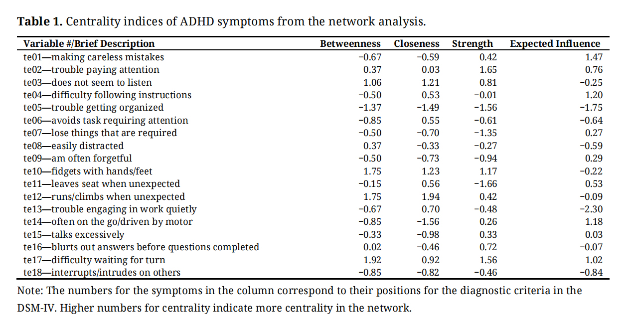 Notwithstanding this, with reference to centrality, it was reported [18] that “easily distracted” and “fidgets with hand/feet” symptoms have relatively higher betweenness and closeness values than the other symptoms. “Difficulty following instructions” and “trouble engaging in work quietly” symptoms have relatively higher expected influence values than the other symptoms. According to [19], “trouble paying attention” and “easily distracted” have relatively higher closeness and degree values than the other symptoms, while [20] reported that “trouble paying attention” and “easily distracted” have relatively higher expected influence values than the other symptoms. It has also been reported [21] that “trouble getting organized” and “interrupts/intrudes on others” symptoms have relatively higher betweenness and closeness values than the other symptoms.
