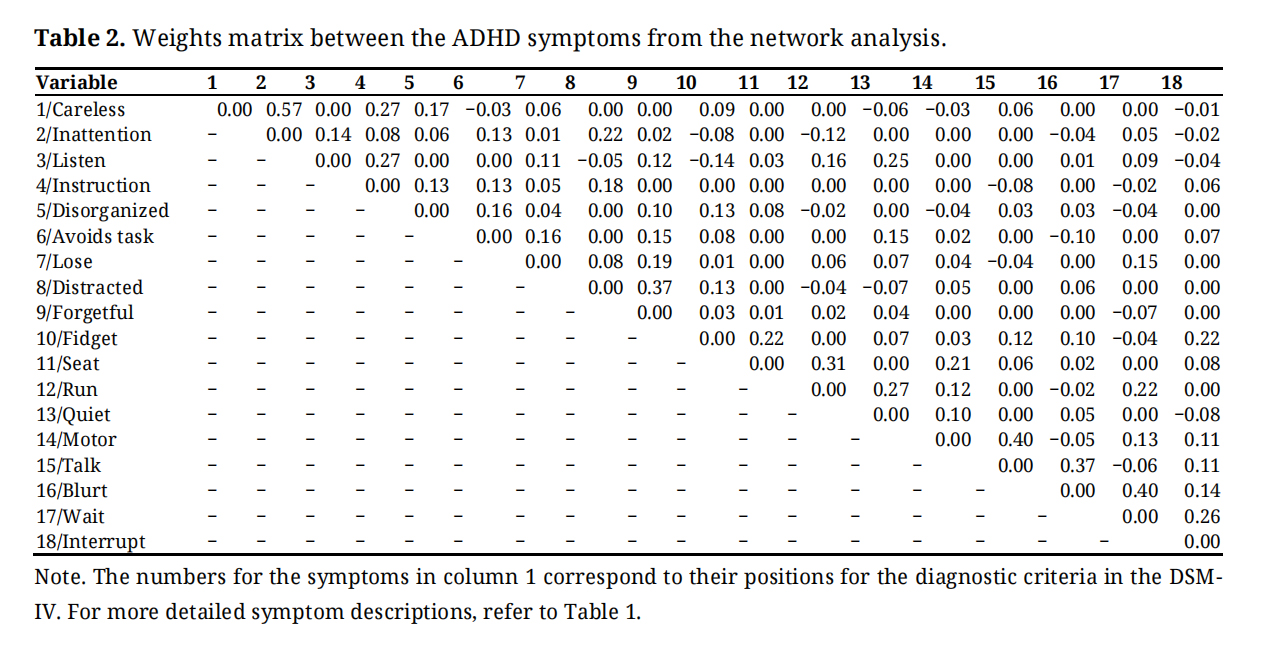 Between IA with HI SymptomsAs shown in Table 2, for the associations between the IA and HI symptoms, no node had a large effect size, and only one had a moderate effect size. This was a positive association between “does not seem to listen” and “trouble engaging in work quietly”. Thus, only one edge could be considered important and worthy of interpretation.