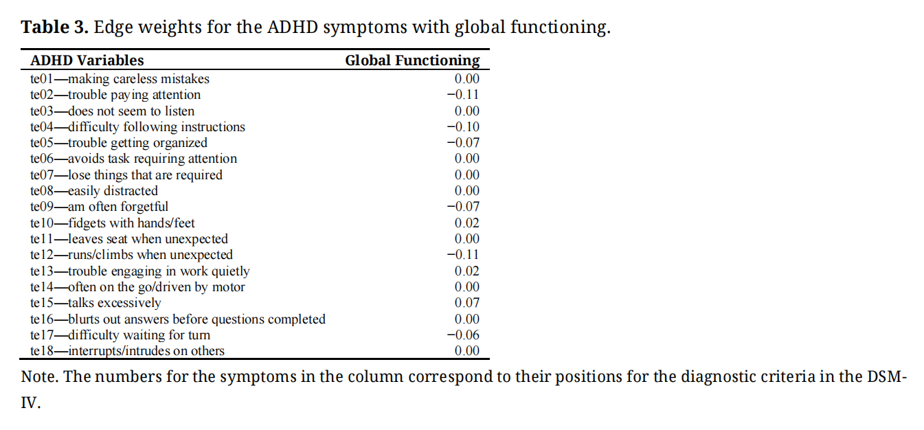 Edge Weights in the Revised Network Model with Global FunctioningTable 3 shows the edge weights for the ADHD symptoms with global functioning (where higher scores indicate higher functionality) in the revised network model that included global functioning. As can be seen, four IA symptoms (“trouble paying attention”, “difficulty following instructions”, “trouble getting organized”, “an often forgetful”) and two HI symptoms (“runs/climbs when not expected” and “difficulty waiting for turn”) were associated negatively and significantly with global functioning. Three HI symptoms (“fidgets with hands/feet”, “trouble engaging in work quietly” and “talks excessively”) showed positive and significant associations with global functioning. All the significant associations were of negligible effect sizes.