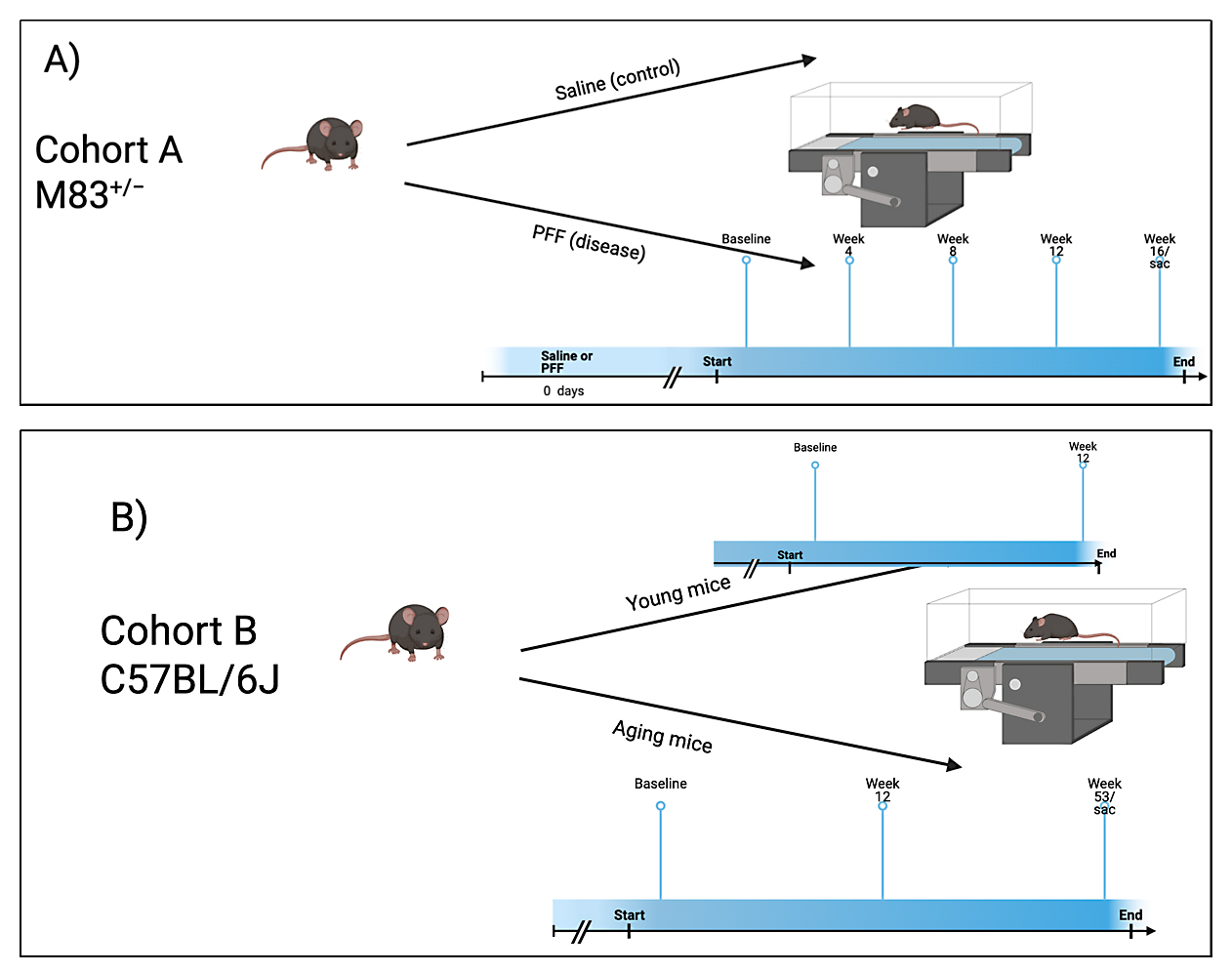Gait evaluations were performed on all mice in both parts I and II of this study. Gait dynamics were recorded using the DigiGait™ (Mouse Specifics, Inc., Framingham, MA, USA) treadmill system with ventral plane videography. For both groups, mice were acclimated by running up to 20.0 cm/s for 30 s. All mice were then run at 20.0 cm/s at a uniform speed between the boundaries of the compartment within the machine. Any measurement not recorded at 20 cm/s were excluded from the study. Any footage where the mouse stopped, jumped, or touched the front or back of the compartment was removed. For the M83+/−+PFF mice, gait metrics were collected every four weeks following injection of PFF/phosphate-buffered saline. For mice in Cohort A, gait metrics were collected at baseline, four weeks, eight weeks, twelve weeks, and sixteen weeks of age after PFF injections at 0° incline. The recording duration was between 3.5 and 4 s. For aged mice, gait metrics were collected at 12 and 53 weeks of age at 0° incline for all timepoints.