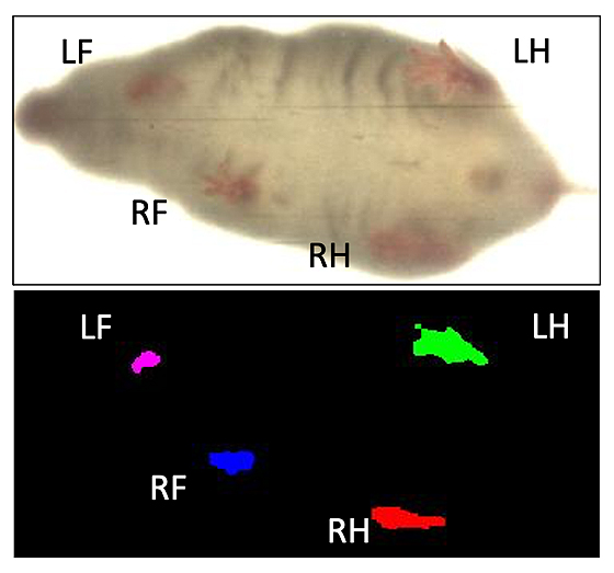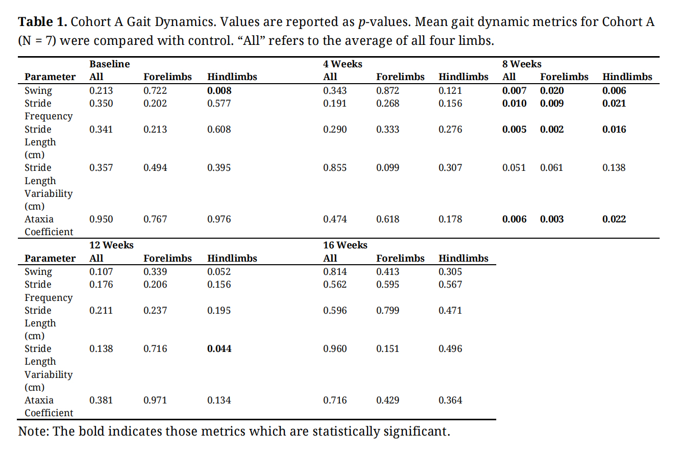 For this study, gait dynamics are classified into three domains—forelimbs, hindlimbs, and all limbs. Forelimb data was obtained by finding the combined average of right front paw and left front paw data. Hindlimb data was obtained by calculating the combined average of right hind paw and left hind paw data. The term “all limbs” refers to the combined average of data from all four paws.