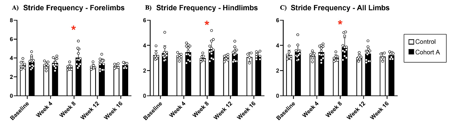 Gait dynamics in this cohort of PFF-injected mice were similar to gait dynamics in the control, saline-treated mice at baseline (Table 1). At week 8, mean (SD) forelimb (Cohort A vs. Control; 0.10 (0.02) vs. 0.13 (0.03), p = 0.020), hindlimb (0.10 (0.03) vs. 0.14 (0.04), p = 0.006), and all limb (0.11 (0.02) vs. 0.13 (0.03), p = 0.007) swing was significantly decreased in PFF-injected mice (Figure 3). Mean (SD) stride frequency for forelimbs (4.0 (0.4) vs. 3.0 (0.5), p = 0.009) hindlimbs (3.8 (0.5) vs. 3.0 (0.5), p = 0.021), and all limbs (3.9 (0.4) vs. 3.0 (0.5), p = 0.010) was significantly increased in PFF-treated mice at 8 weeks (Figure 4). Stride length (mean (SD)) for forelimbs (6.0 (0.5) vs. 7.0 (0.5), p = 0.002), hindlimbs (6.5 (0.4) vs. 8.0 (0.6), p = 0.016), and all limbs (6.0 (0.4) vs. 7.0 (0.5), p = 0.005) was significantly decreased in PFF-treated mice, though this effect was not seen until 12 weeks (Figure 5). Variability in stride length was significantly decreased in PFF-treated mice in the hindlimbs at 12 weeks (1.2 (0.8) vs. 1.9 (1.0), p = 0.044, Figure 6). The mean (SD) ataxia coefficient was significantly increased in the forelimbs (1.5 (0.5) vs. 0.9 (0.4) p = 0.003), hindlimbs (0.8 (0.6) vs. 0.4 (0.5) p = 0.022), and all limbs (1.1 (0.4) vs. 0.6 (0.4) p = 0.006) of PFF-treated mice at 8 weeks as compared with control (Figure 7). The most significant changes could be seen at 8 weeks post-PFF treatment. While swing, stride, and other metrics continued to change at 12 and 16 weeks, no statistical significance was observed, for some the animals started to develop motor symptoms due to PFF and were unable to run on the treadmill and were subsequently removed from the study.
