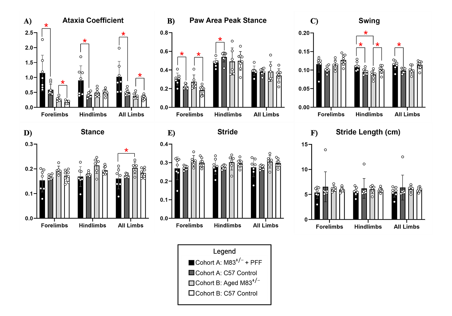 Figure 8. Cohort B Gait Dynamics. (A) Ataxia coefficient, (B) paw area peak stance, (C) swing, (D) stance, (E) stride, and (F) stride length (cm) was measured and compared between young 12-13-week-old M83+/−+PFF mice, aged 52-53-week-old M83+/− mice, and age-matched C57 control (12-13- and 52-53-weeks-old, respectively). Red “*” represents statistically significant differences between the groups.