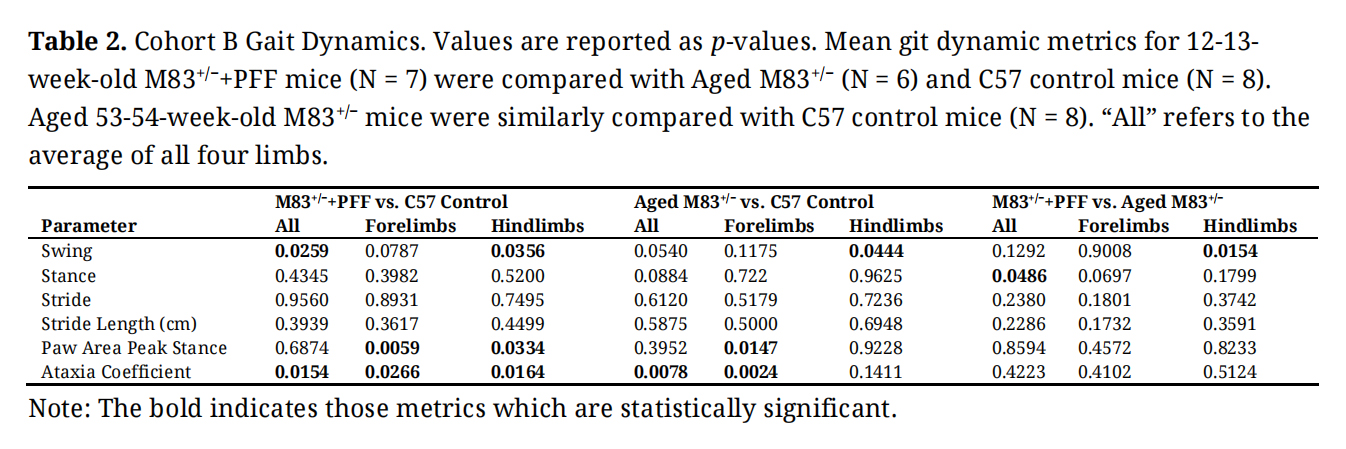 Table 2. Cohort B Gait Dynamics. Values are reported as p-values. Mean git dynamic metrics for 12-13-week-old M83+/−+PFF mice (N = 7) were compared with Aged M83+/− (N = 6) and C57 control mice (N = 8). Aged 53-54-week-old M83+/− mice were similarly compared with C57 control mice (N = 8). “All” refers to the average of all four limbs.