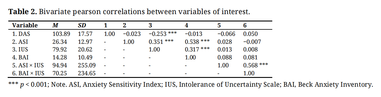 A partial correlation was performed, with Bonferroni corrections, to examine the relationship between DAS, ASI, IUS, and BAI, while controlling for relationship status. The correlations between DAS and ASI, r(173) = −0.018, p = 0.818, and DAS and BAI, r(173) = −0.014, p = 0.850, were not found to be statistically significant. The correlation between DAS and IUS, r(173) = −0.248, p < 0.001, ASI and IUS, r(173) = 0.351, p < 0.001, ASI and BAI, r(173) = 0.527, p < 0.001, and IUS and BAI, r(173) = 0.329, p < 0.001, were found to be statistically significant (Table 2). Condition indices (condition index < 20) and tolerance values (tolerance > 0.6) were within the acceptable range for each model.