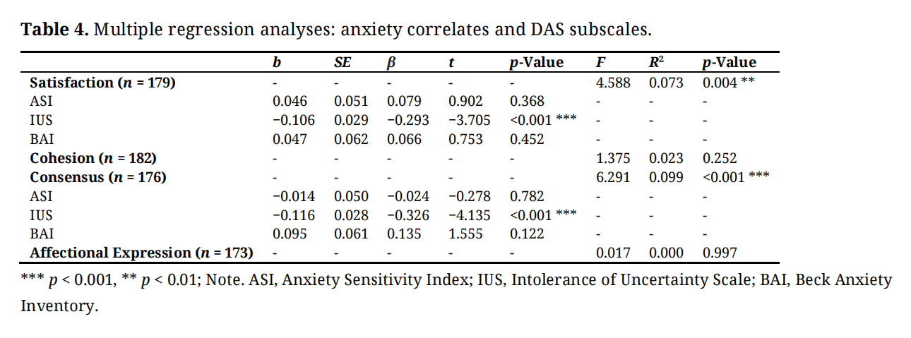 A series of multiple regressions were performed to determine whether the relationship between the IUS, ASI, BAI, and dyadic adjustment varies based on the domain of the DAS. The overall models (Table 4) for the DAS consensus and satisfaction subscales were significant and accounted for 7.3% and 9.9% of the variance respectively. Across both significant models, higher IUS was associated with lower DAS.