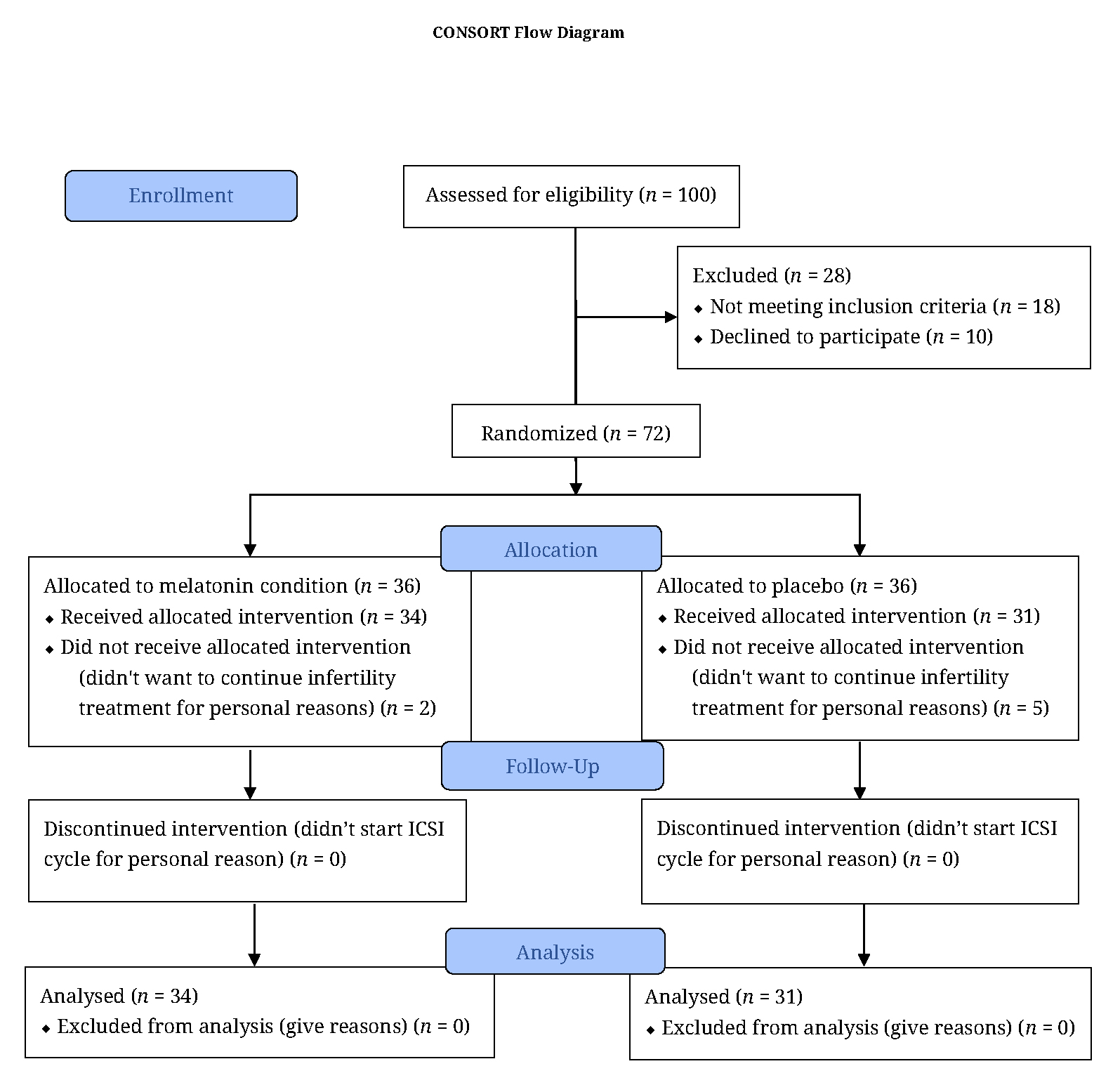 Among the 72 participants initially assessed for the study, 34 participants in the melatonin group and 31 participants in control group continued the study (see flowchart).