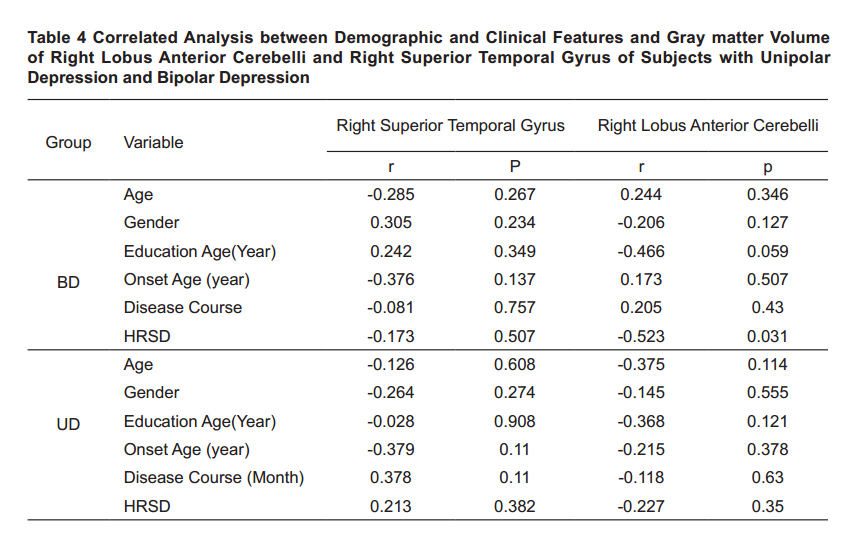 3. Correlation Analysis between Gray matter Volume and Clinical Features of Right Lobus Anterior Cerebelli and Right Superior Temporal Gyrus of Subjects with Unipolar Depression and Bipolar Depression.The gray matter volume of right lobus anterior cerebelli of subjects with bipolar depression is significantly negatively correlated with the total score of HRSD, see Table 4.