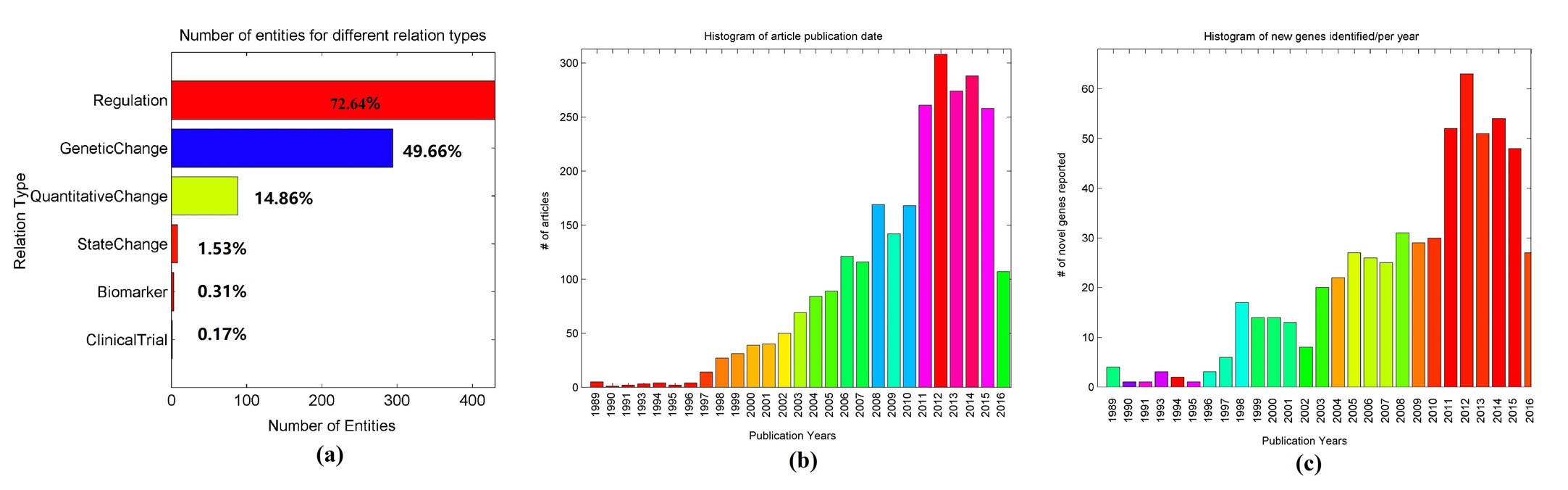 Fig 1 Histogram of the publications reporting gene-disease relationships between anxiety and 592 genes. (a) Number of genes for different relation types; (b) number of article publications by year; (c) number of novel genes identified in each year.