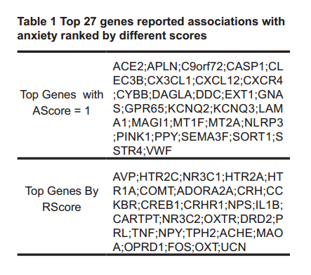 Among the 592 anxiety related genes, 27 were reported in 2016 with an AScore = 1, and are listed in Table 1. For comparison purposes, Table 1 also lists the top 27 genes with the highest Rscore (in descending order). Full results are provided in Supplementary Table S1.