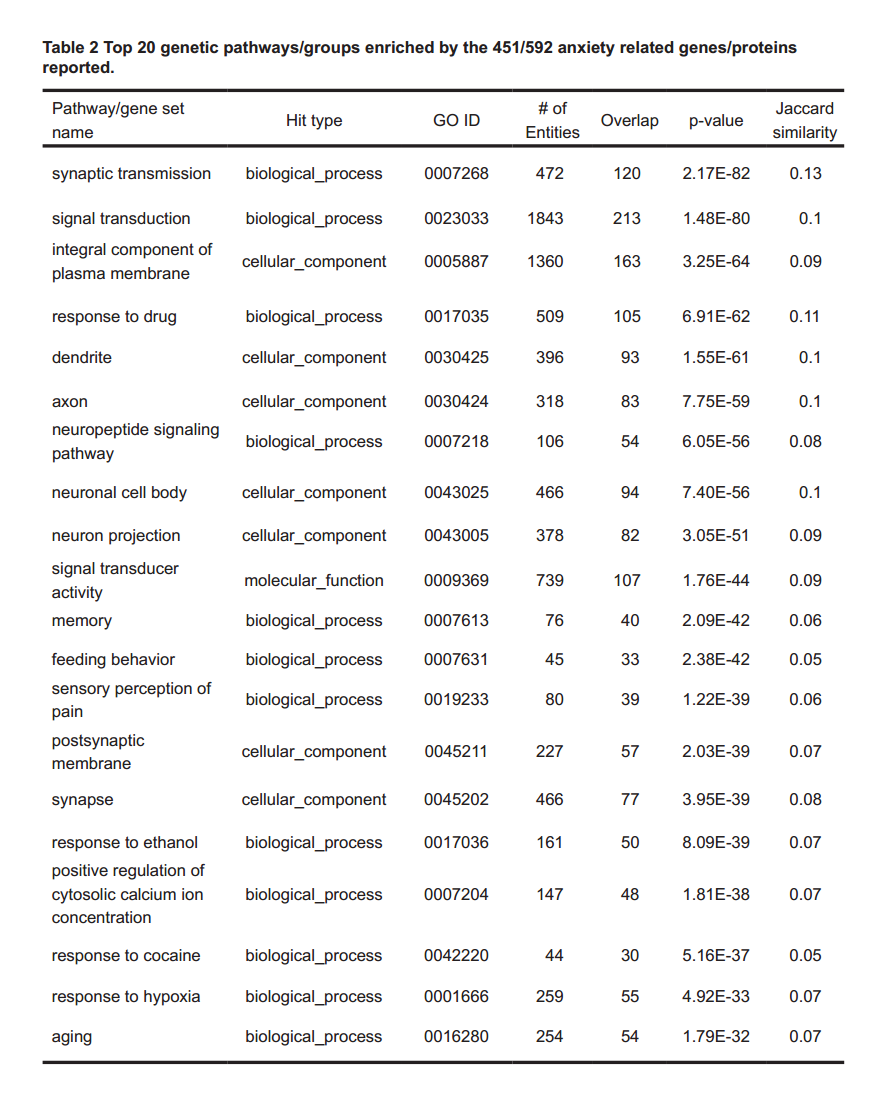 table 2 top 20 genetic pathways/groups enriched by the 451/592 anxiety related genes/proteins reported.