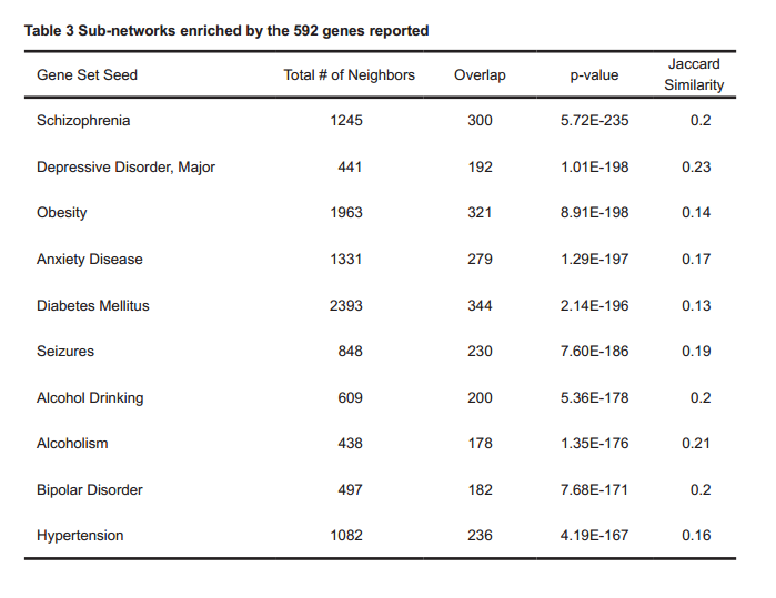 In addition to PEA, we performed a sub-network enrichment analysis in order to relate the anxiety associated genes with other diseases in an unbiased fashion. The SNEA results demonstrated that many of the 592 genes (>70%) were also identified as genes associated for other mental disorders (i.e. Schizophrenia, Major Depressive Disorder, Bipolar Disorder) emphasizing the importance of these genes functionally associated with anxiety.