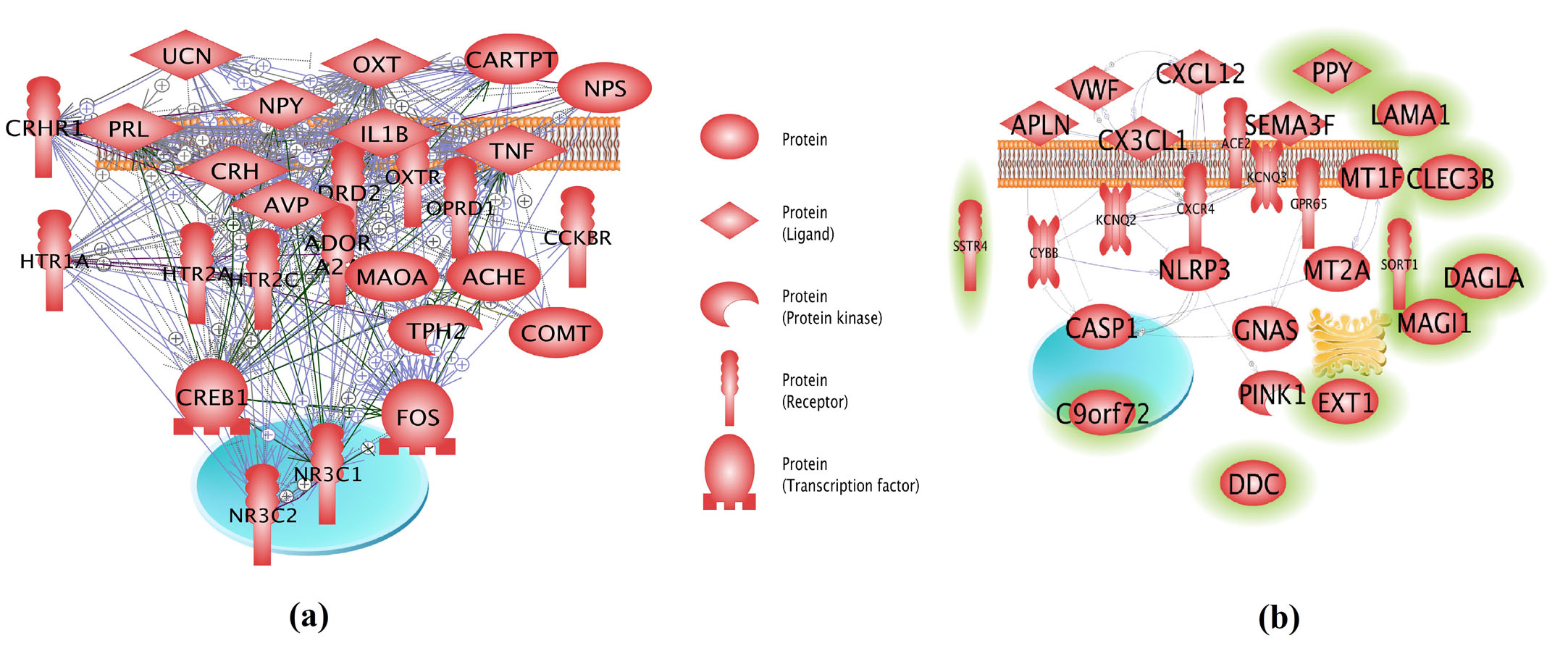 Of the 592 genes associated with anxiety, 430 (72.6 %) genes represented a relationship of regulation to the disease, 294 (49.7 %) genes represented a relationship of genetic change with the disease, 88 (14.9 %) genes represented a relationship of quantitative change with the disease, 8 (1.5 %) genes represented a relationship of state change with the disease, 3 (0.3 %) genes represented a relationship of biomarker with the disease, and 1 (0.2 %) genes was associated with a clinical trial (Figure 1a). Please note, 178 (30.1 %) of these genes have been reported to have multiple relationships with the disease. Specifically, 414 (69.9 %) genes were extracted with only one type of relationship to the disease, 132 (22.3 %) with 2, 3.7 (6.4 %) with 3, and 8 (1.35 %) with 4. For detailed definition and description of these relation types, please refer to the ‘Relation Types and Definitions’ section at Pathway Studio ResNet Database Description and Workflow Examples.