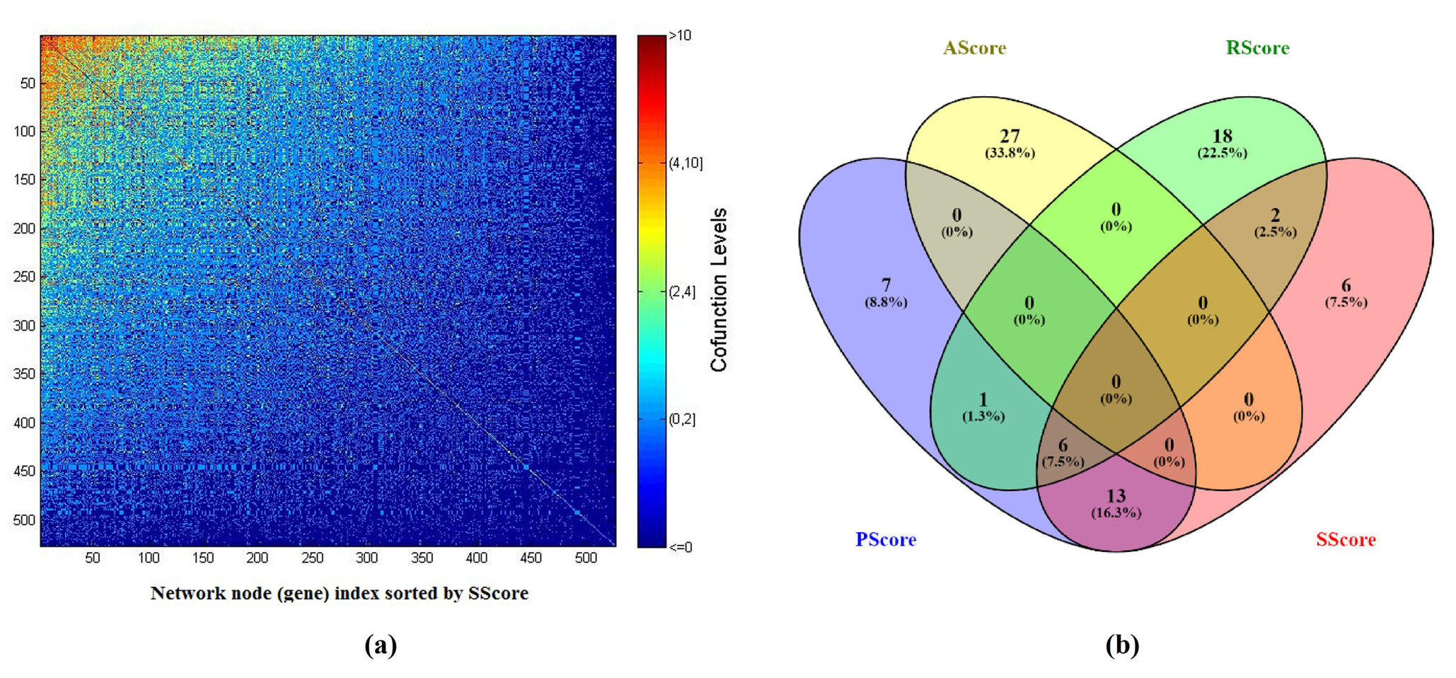 Fig 3 Comparison of different metrics ranking the 592 genes. (a) Adjacency matrix of the genetic network built with the 526/592 genes as nodes and PNCA generated weights; (b) A Venn diagram of top 27 genes selected by different metrics.