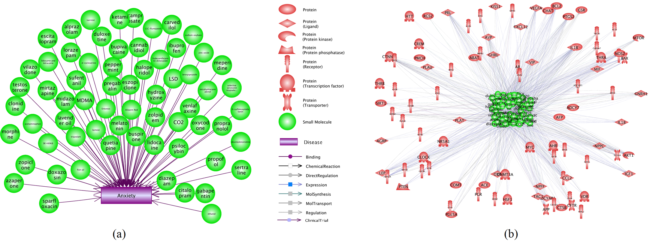 Fig 4 Drugs studied in the context of anxiety and their relation with the candidate anxiety genes. (a) The 65 drugs/small molecules studied in clinical trials for the treatment of anxiety; (b) The top 1,000 relations between the 65 drugs and 437 anxiety candidate genes.
