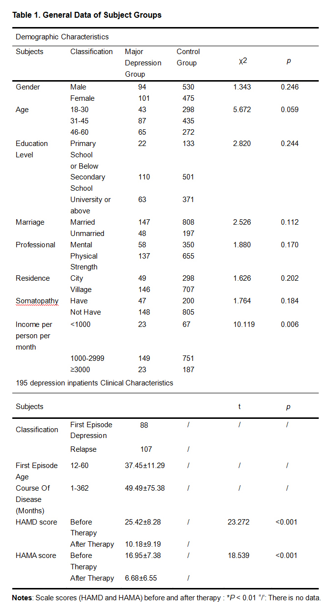 195 depression inpatients including 94 male and 101 female were selected from Chongqing Mental Health Center from January 2015 to December 2015. They were identified to comply with the major depression diagnosis criteria of “Mental and Behavioral Disorders of International Classification of Diseases (ICD-10) ”. They were all Han Chinese and aged 18 - 60 years old, with a mean age of 42.27 ± 11.70 years old and average education level of 11.66 ± 3.66 years. Exclusion criteria: a. patients with color blindness and color amblyopia; b. patients whose organic mental diseases and acute mental disorders cannot be thoroughly investigated. This research experiment was approved by the local ethics committee. The written informed consents were signed by all subjects before the experiment. The difference of gender, age and education level and other data between the two groups was not statistically significant (p > 0.05).