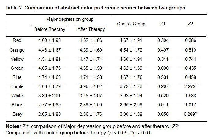 The abstract color preference sequence of study group was sorted from high to low: blue, green, red, yellow, orange, purple, white, grey and black. Compared with the control group, the rank correlation coefficient r = 0.833, and statistically significant test u = 3.023 > 2.58, so p < 0.01, which indicated that the rank correlation of color preference sequence between Major depression group and control group was statistically significant and their tendencies in color choice were consistent. The color preference sequence after therapy was sorted from high to low: blue, green, red, yellow, orange, purple, white, black and grey. Compared with the preference sequence before therapy, the rank correlation coefficient r = 0.944 after rank correlation treatment and statistically significant test u = 3.440 > 2.58, so p < 0.01, which indicated that preference sequence tendencies before and after therapy were consistent and they both preferred for blue.