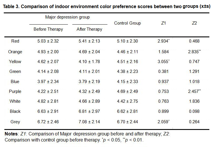 The indoor environment color preference sequence of Major depression group was sorted from high to low: blue, green, purple, yellow, white, orange, red, black and grey. Compared with the control group, the rank correlation coefficient r = 0.722, and statistically significant test u = 2.606 > 2.58, so p < 0.01, which indicated that the rank correlation of color preference sequence between Major depression group and control group was statistically significant and their tendencies in color choice were consistent.