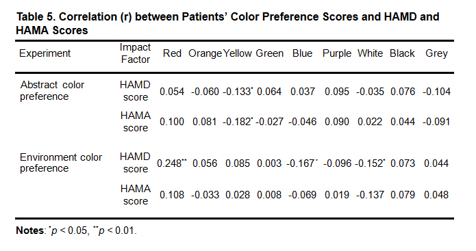 Table 5. Correlation (r) between Patients’ Color Preference Scores and HAMD and HAMA Scores