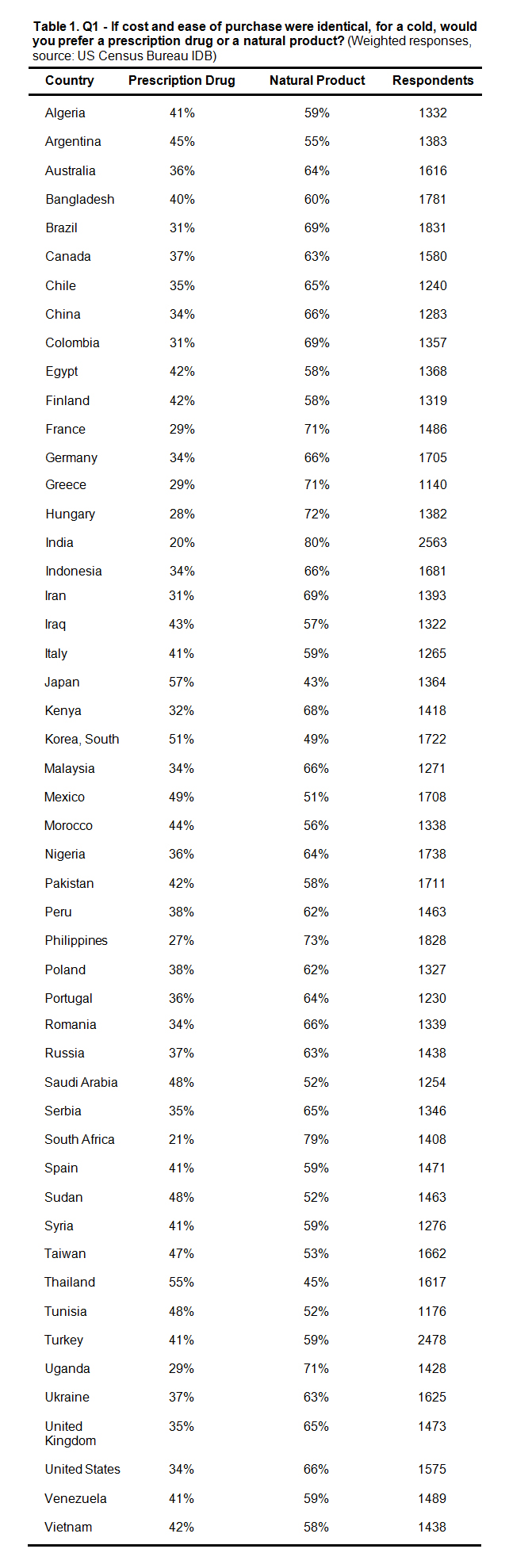 The survey has several limitations. Only individuals with Internet access (skewed toward young males, the relatively well-to-do, and the better educated) during July 2017 were reached. Currently, only approximately 40 % of the world has access to the Internet. Furthermore, in order to avoid burdening respondents with survey fatigue and increasing self-selection bias, only two health conditions were investigated. Comparisons of “nervousness” with conditions more serious than the common cold would have been interesting. It would also have been interesting to probe respondents’ reasons for their choice. Since many conventional drugs (e.g. digitalis, reserpine, scopolamine, quinine) have been derived from herbs, and since doctors sometimes prescribe herbal preparations, the distinction between natural and prescription drugs may have been confusing to respondents. This may have been especially the case in Japan where herbal products are prescribed by physicians.