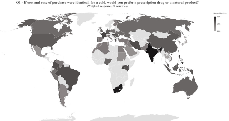 In July 2017, we conducted a 50-country online survey asking random respondents about their preferences for natural remedies versus prescriptions for “nervous conditions” and for a control condition, the common cold. We used the global sampling methodology, Random Domain Intercept Technology (RDITTM). Exposure to our questions is triggered when Web users manually type in a lapsed or dormant Website destination (e.g., www.phoneyurl.com) into the Web address (URL) bar[9, 10]. When Web users land on a RDIT-controlled website, we are able to collect response data that are totally anonymous. The method encourages quick, instinctive answers from random individuals who are not self-selected survey takers and who have no incentive to respond other than a curiosity about the questions posed. The methodology has been previously used to measure global mental health stigma[11] and also the prevalence of suicidal ideas on college campuses[12]. It has shown high test-retest reliability in global surveys[13] as long as the questions that are posed are relatively few, short, and straightforward.