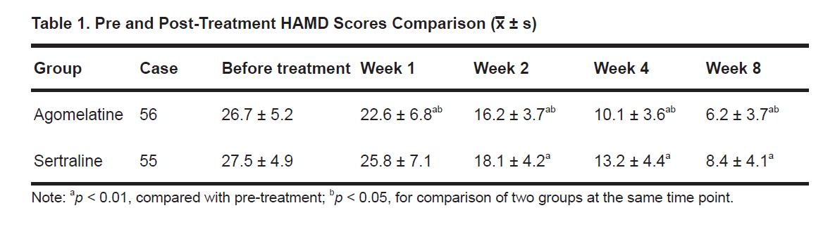 2.2 Treatment methodAgomelatine group subjects were administered agomelatine (25 mg/tablet, lot No.: H20143375), beginning with a a small dosage and which was increase to in the second week. The minimum treatment dosage was 12.5 mg and the maximum dosage was 50 mg. Sertraline group subjects were administered a 50 mg/tablet, (lot No.: H10980141), started from a small dosage and then added to treatment dosage within two weeks.