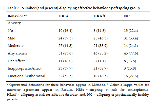 We also included other affective indicators that could be viewed as interpersonally maladaptive, such as low positive affect, anxiety, inappropriate affect, and/or flat affect. We examined whether any of these affective indicators of risk for the later development of psychopathology would be relatively specific for schizophrenia. As children of mothers with depression are at risk for the later development of psychopathology [13,14], that offspring group served as a psychiatric comparison.
