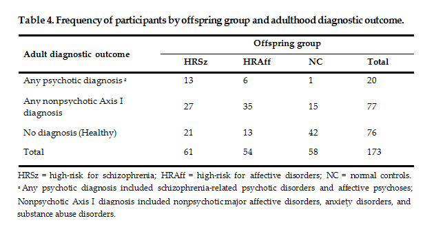 Table 4. Frequency of participants by offspring group and adulthood diagnostic outcome.
