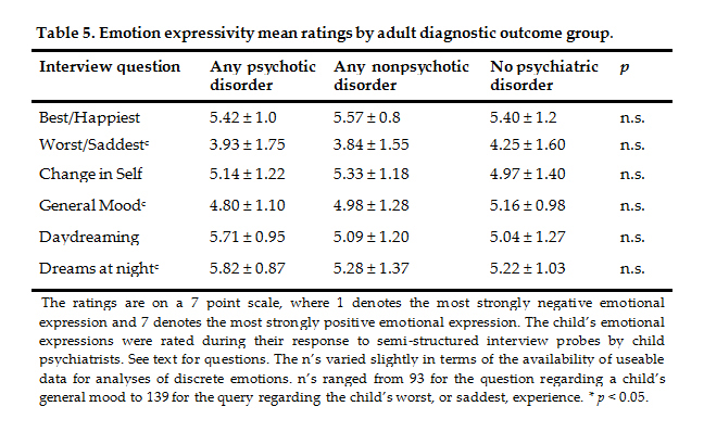 Given the relatively small size of some of the outcome diagnostic groups, we compared the groups in terms of psychotic disorders versus nonpsychotic disorders, and psychiatric disorder versus no psychiatric disorder. The mean ratings of emotion expressivity by adult diagnostic outcome and interview question appear in Table 5. None of the displays of discrete emotions during mid-childhood were associated with adult diagnostic outcomes.