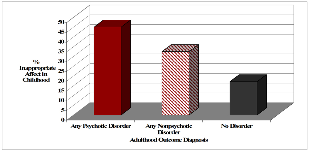 One of the advantages of the prospective high-risk design is that it permits the study of behavioral antecedents of adulthood psychiatric outcomes. Our observation of an association between inappropriate affect during childhood and later adulthood diagnostic outcome implies a role for inappropriate affect as a psychopathology risk-related factor. Individuals who developed a psychiatric disorder in adulthood, whether psychotic or nonpsychotic, showed inappropriate affect more frequently than children who did not develop psychiatric illness. This suggests that inappropriate affect in the offspring of psychiatrically ill parents may be a nonspecific indication of risk for the development of adulthood psychopathology.