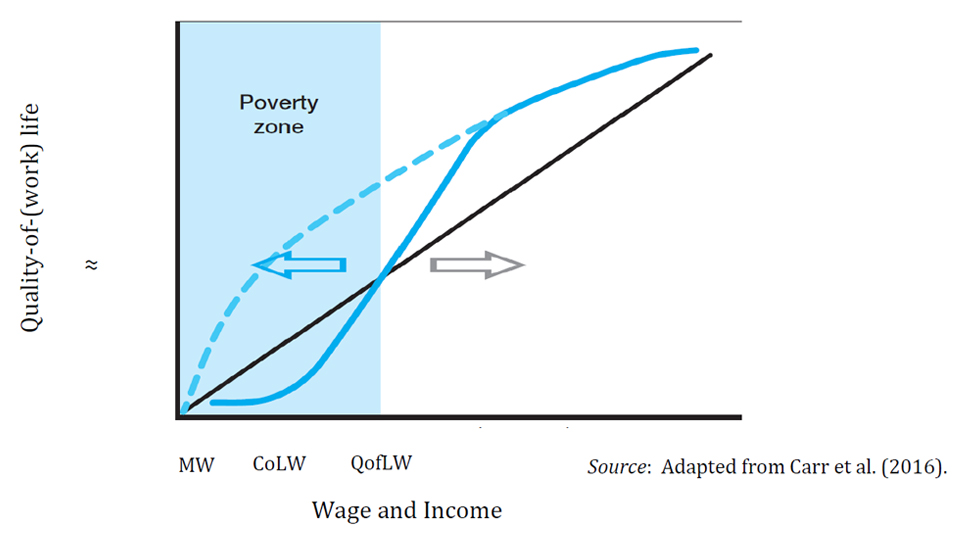 Figure 1. Quality of (work) life along the Wage and Income spectrum. Key: MW = Legal Minimum Wage; CoLW = Cost-of-Living Wage; QoLW = Quality-of-Living Wage; ≈ = balance in quality of (work) life. Adapted with permission from Carr et al. [10].