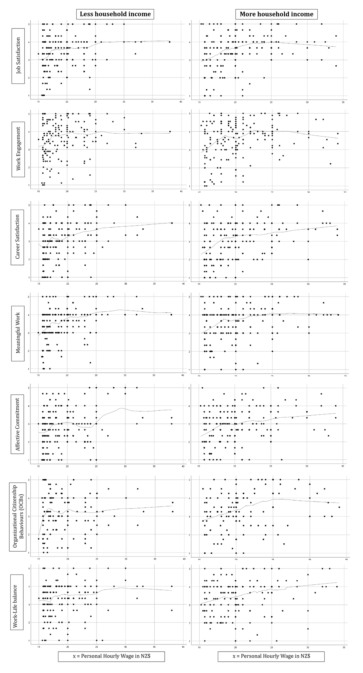 This variable was therefore computed by converting NZ$5000 categories (for both personal income and household incomes) to an interval scale from 1 to 12, and subtracting the former from the latter, to derive a household-income-net-of-personal income score (Households with combined incomes over NZ$60,000, which scored 13+ on the band score, were converted to value missing, in order to keep each variable, personal income and household income, on equivalent scales). Any negative values (household gross income less than individual net, which would not be possible, n = 16) were removed from subsequent analyses. In order to convert the derived interval scale score, which was continuous, to a discrete moderator variable, a median split was used. This created a low (n = 304) versus high (n = 310) buffer variable, with a total usable N = 614. Split-file was then applied in SPSS to produce separate LOESS curves for each half of the net-household income group, for each job attitude as a function of hourly wage, at the individual level, by utilising a protocol in Carr et al. [25]. Applying this protocol to determine the point at which the curves were neither too smooth nor too jagged, the tension parameter was eventually set to 0.40, and the kernel function was Epanechnikov. The resulting LOESS curves, two graphs for each of the job attitudes that formed our criterion variables, are presented in Figure 2.