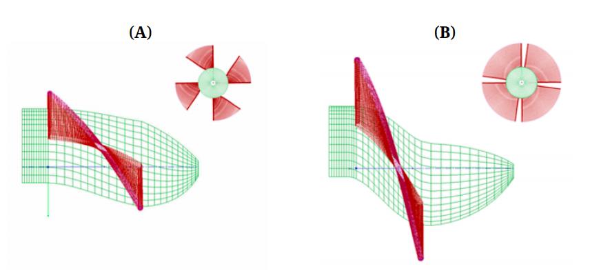 For fixed geometry reaction turbines, typically used in low head installations, the efficiency drops off dramatically when the turbine does not operate at its design point, as shown in Figure 10. When the flow rate changes from the design point, the flow field approaching the runner of a reaction turbine is changed. Therefore, the blade angles are not matched to the flow with a fixed geometry turbine runner, significantly reducing the turbine operating efficiency [59]. One option to solve this would be to use variable geometry inlets or runners, as in a full Kaplan or Francis turbine. However, these are mechanically complex at pico-scale, and would incur energy overheads which would render the system not economically viable [59]. (These are possible with Crossflow turbines due to the simplicity of the nozzle mechanism, requiring a single vane.) A simpler option would be to change the runner, with one runner during the low flow period and a second for the higher flow season. This would allow the turbine to operate more efficiently throughout the year and increase overall energy generation. For a site at Magdalena, Peru, a propeller turbine was designed for a 4 m head with a scroll casing, but no guide vanes. The original runner, Figure 14A, only worked well when flows were above 290 L/s, giving a shaft power output of 6.1 kW. A second runner, Figure 14B, was designed for lower flow rates giving 5.3 kW at 180 L/s. This demonstrates the potential for using different runners, designed for different flow rates, within the same casing [60].