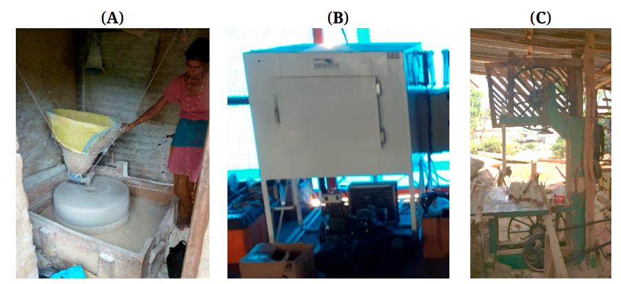 Figure 15. Potential income generating loads: (A) agricultural product processing, (B) ice-maker for fishermen, and (C) furniture workshop (Photo credit: (A) and (B) Sam Williamson, (C) Surendra Pandit, PEEDA).