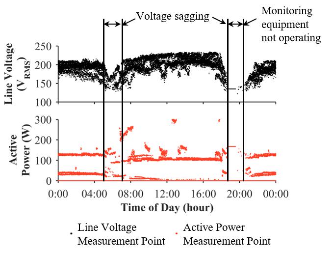 Figure 16. Line voltage and power demand on a pico-hydropower system in Nepal, measured over 5 days [71].