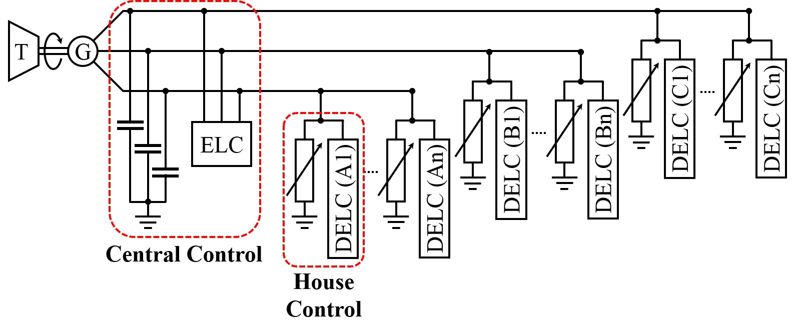 An alternative approach to load control for use in cases where a village is supplied by a single generator has been developed and is known as a distributed electronic load controller (DELC) [77]; a schematic is shown in Figure 18. An individual DELC is installed at each household, and each household is assigned a power consumption. When the household load is below the assigned threshold, the DELC diverts the extra available current to a useful sink for the excess power, typically a load such as a water heater or rice cooker. A smaller ELC is still installed at the generator to accurately regulate the output voltage, but it does not have to take the full generator rating as the household DELCs absorb most of the excess load. One drawback to this system is that it still does not regulate household consumption, and so system overloads are still possible. However, it does provide some redundancy as there are several ELCs able to regulate the output if there is a failure in one of the switches. A further practical need is minimising the cost of producing individual DELCs for each household for the system to be economically viable in low income villages.