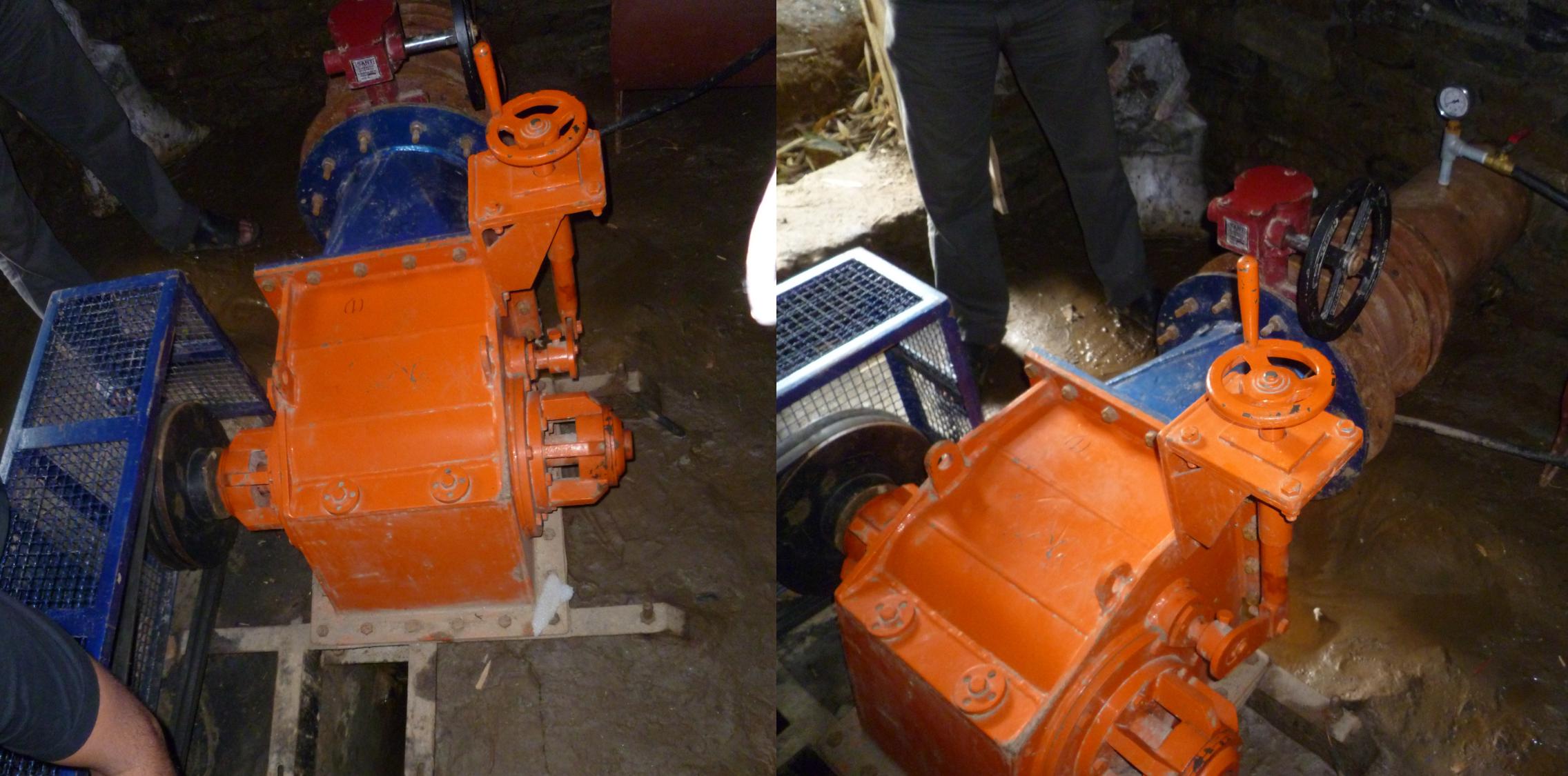 In Nepal, a locally designed and developed low-head pico-hydro propeller (axial) turbine has been undergoing research lab tests, whilst a number of examples have been installed at sites across the country [37]. The PT series turbine, originally developed by Nepal Hydro and Electric and the United Mission to Nepal, has gone through two iterations. Initially an open flume design was used, similar to those in Figure 3. Later installations used a closed flume design with a volute casing, as shown in Figure 6A. This second design removed the need for a submerged bearing, increasing the reliability of the system. The complete system water-to-wire efficiency, using an induction machine as a generator, was measured to be 54%, with the turbine efficiency estimated to be around 77%, the other losses coming from the control system and generator. The results from the turbine testing at Kathmandu University are shown in Figure 6B. A family of the PT turbines has been developed, ranging from 0.3 kW to 3 kW, using non-dimensional scaling, and able to be matched with standard induction generators, which reduces the cost of implementation.