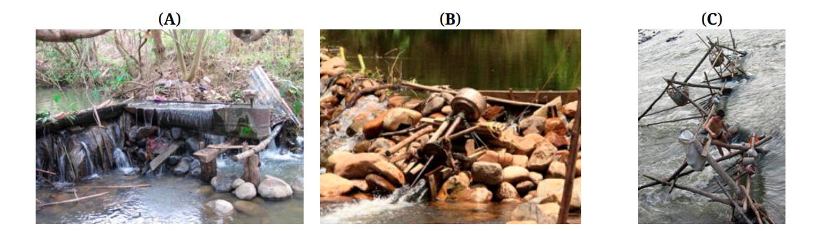 Only a few metres of head is required to operate some turbine designs, and low-head turbine sites are prevalent all over the world [19]. Many installations of locally built mills already exist. For example, locally built mills in South Asia, known as Ghatta or Gharat, have operated with low head for many years. There are several off-the-shelf solutions for low-head turbines. These are typically open flume axial flow turbines, with examples including the PowerPal LH series [20], the PowerSpout LH [21], and the Energy Systems and Design LH1000 [22]. These units are all of similar design, manufactured to a good quality and available worldwide. There are also poorly manufactured versions of these turbines, which are sold for a very low cost in China, Vietnam and Laos [23]. These systems are often called “family hydro” [24], due to their use by a single family, and can be locally modified to adapt to the river conditions [25], as shown in Figure 3.