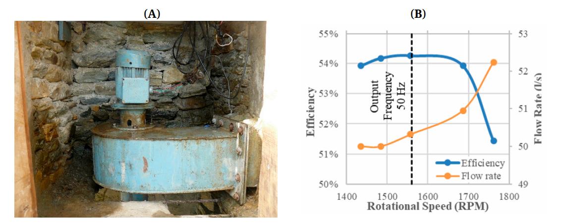 Figure 6. (A) Photo of PT03 turbine implemented in Nepal (Photo credit: Sam Williamson). (B) Power curve for PT1 turbine measured at Kathmandu University’s Turbine Testing Laboratory [38].