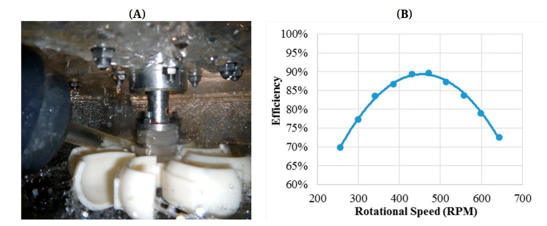 Figure 12. (A) Torque generation mechanism for Turgo turbine. (B) Low-head Turgo turbine tested at variable heads and flow rates [31].
