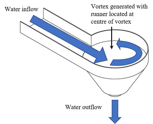 The Gravitational Water Vortex Power Plant [41] has been proposed as an efficient, multi-use turbine system, with the ability to generate power, aerate the water and allow fish migration paths without the need for fish ladders. The turbine basin generates a vortex, exiting at the base of the basin, as shown in Figure 8. A turbine is placed in the centre of the vortex, using the rotational water field to generate torque on the runner. It has been implemented in sites in Austria [40], Indonesia, Nepal [42,43] and Peru [44], as well as being studied for its application in waste water plants in Ireland [45]. This turbine does not require any complicated manufacturing processes, with only metal rolling and welding required. However, there is some scepticism in its use [46], with low efficiencies found in some laboratory experiments [42,44,45], whilst some authors claim higher efficiencies, close to 75%, at 1.5 m head and water flow rate of 0.2 m³/s [43].